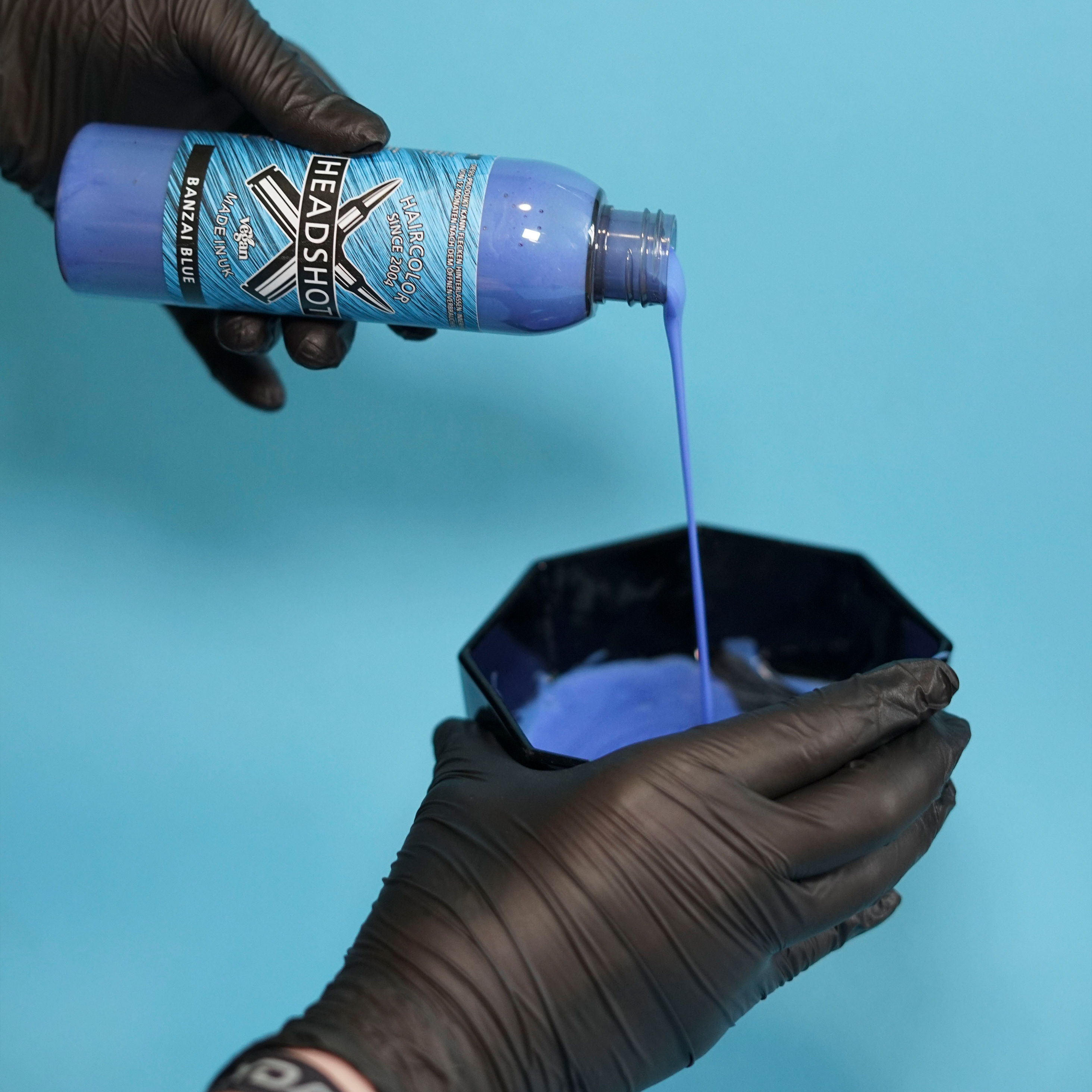Färbeschaleund Färbepinselund die unglaublich extravagante und wunderschöne, blaue Haarfarbe BanzaiBluevon Headshot.