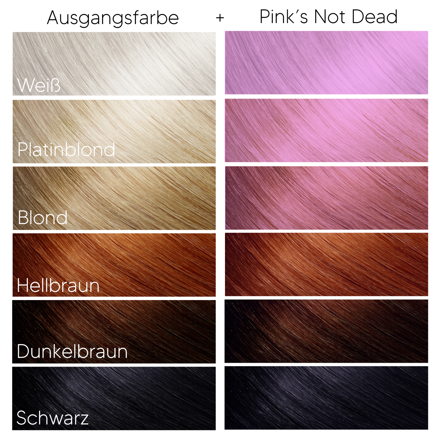 Pink´s not Dead is a very light pastel shade of pink. For best results your hair needs to be bleached white blonde. If there is any hint of yellow left in your hair, the results be falsified.