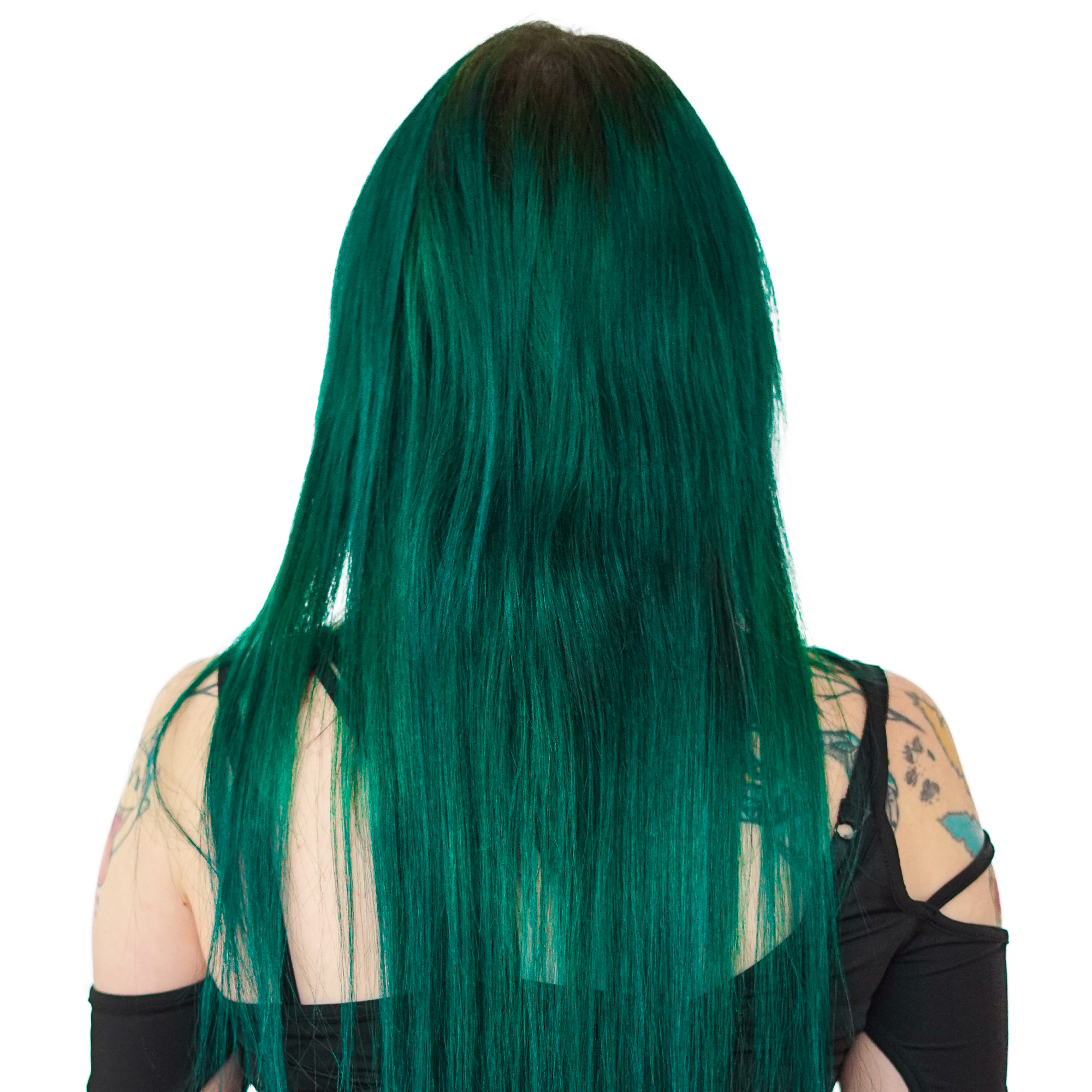 Unsere Haarfarbe Toxic Absinth ist etwas echt Besonderes. Dieser Grünton ist sehr dunkel und hat einen Blaustich. Auch hier gilt, willst du die absolute Farbexplosion, dann musst du deine Mähne blondieren. Auch der Blaustich wird extremer, je heller dein Haar ist. Dieser dunkle Grünton funktioniert aber auch auf nicht so stark aufgehelltem Haar. Und nun der absolute Hammer, dreh durch und klatsch in die Hände!!! Diese Headshot Haarfarbentönung ist auch für unblondiertes Haar geeignet. Ja, ist denn das die Möglichkeit? Alter Falter! Hier gilt je dunkler dein Haar, desto gedämpfter wird das Ergebnis. Wenn du dunkles Haar hast, erscheint lediglich ein mystischer grüner Farbschimmer. Wie du deine Haare korrekt blondierst findest du hier.