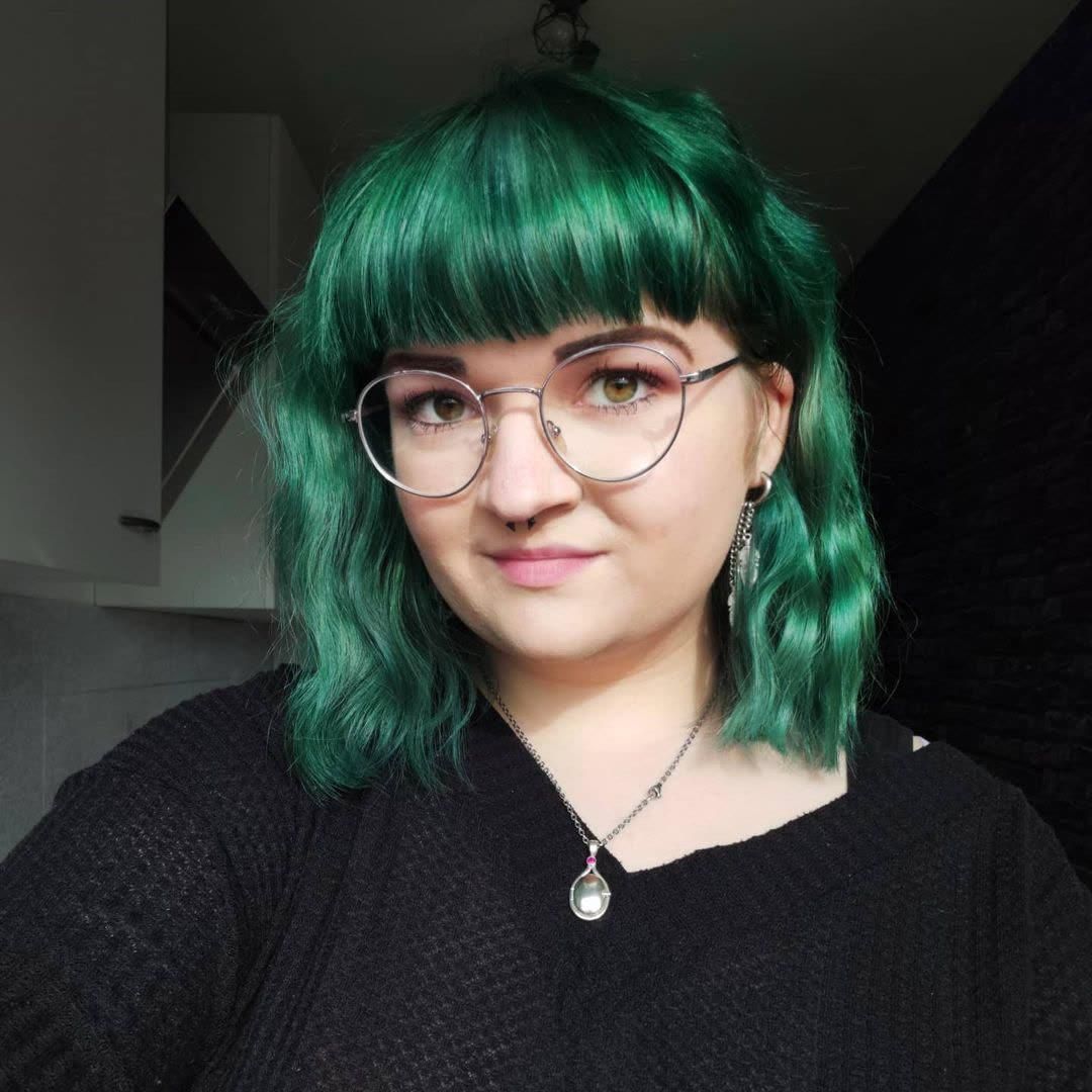 Toxic Absinth is a very dark shade of green with hints of blue coming through. There is no need to bleach your hair to a light blonde for this one. But the blue streaks will be more noticeable the lighter blonde your hair is. It is also possible to use this dye on unbleached dark hair but the color will be less lively. On dark hair you will only get a gleam of green.