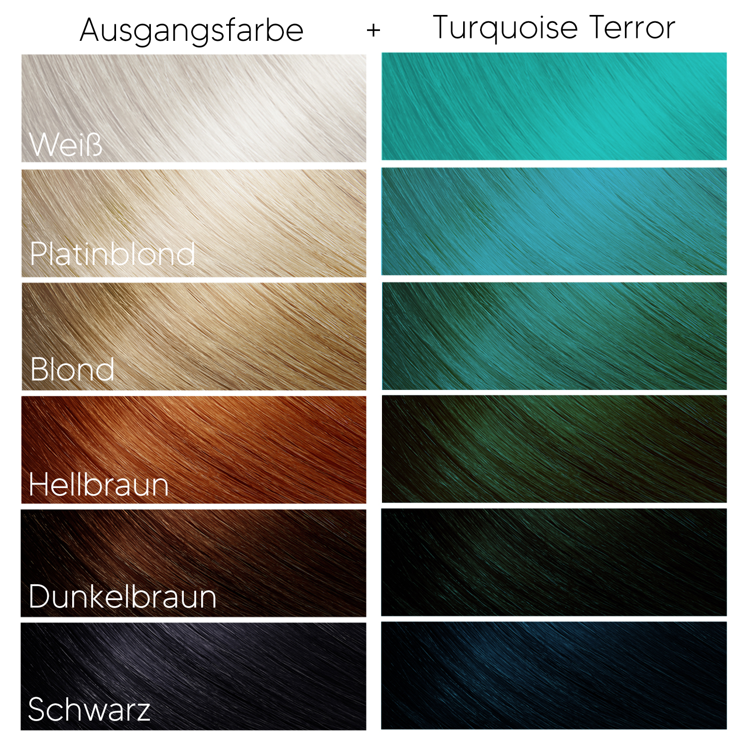 Turquoise Terror is a very blueish shade of turquoise. It is necessary to make sure that after bleaching your hair, there are no streaks of orange or red left. Also, if there is any yellow left the result will be a more greenish shade of turquoise.