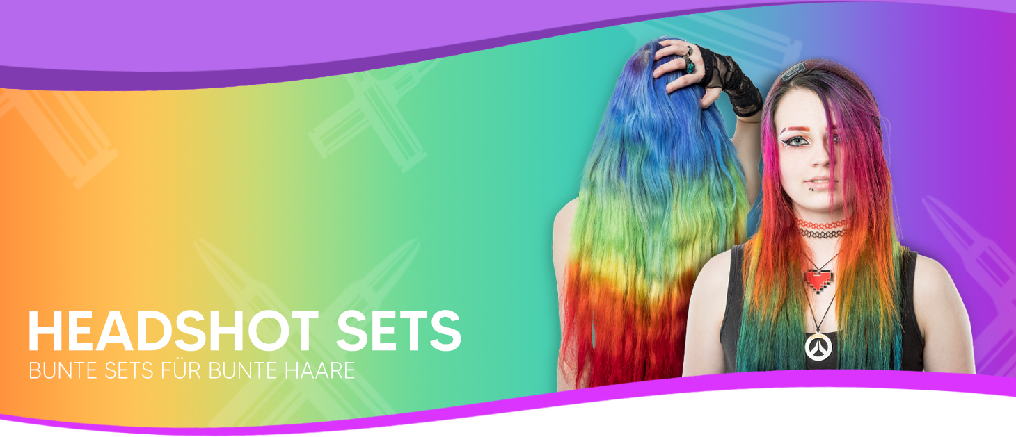 The rainbow set is presented in a Headshot gift box and contains 6 bottles of Headshot hair dye. This is all you need to create rainbow hair.1 x Hellfire Red (150 ml), 1 x Captain Carrot (150 ml), 1 x Yippie Ya Yellow (150 ml), 1 x Bluecifer (150 ml), 1 x Psycho Purple (150 ml), 1 x Danger! Danger! (150 ml)With 150 ml contents our Headshot bottles contain way more dye than the ones of other brands. Also our hair dye is vegan, not tested on animals and it is produced in Europe.